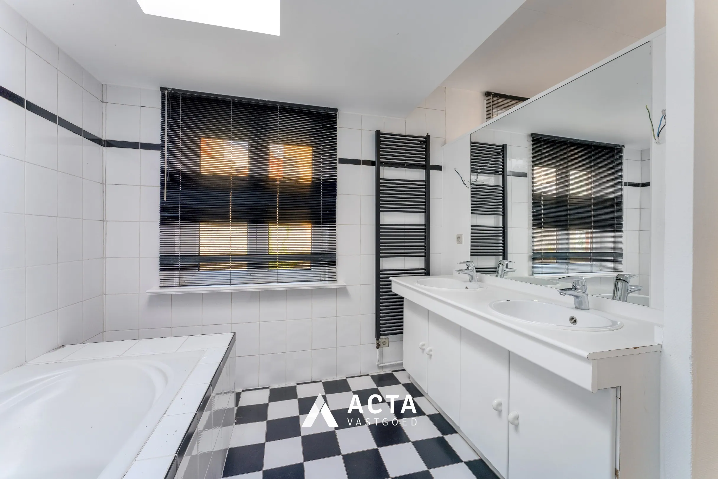 Achteraan de woning ligt de volledig betegelde badkamer, uitgerust met een ligbad (met douchefunctie), handdoekradiator en een dubbele lavabo met spiegel- en onderkast.